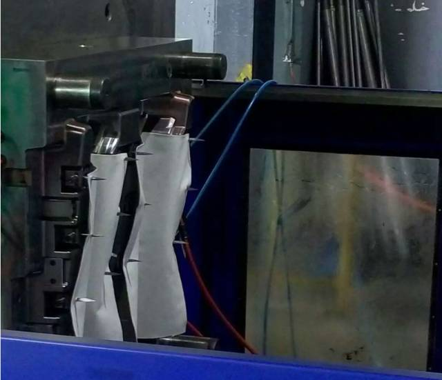低压注塑模具主要原理是注塑压力较低在布上流动,开模时要先把布挂到前模挂针上,合模、注塑、然后取件。